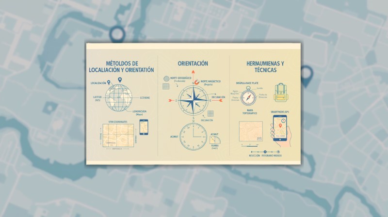 Localización absoluta y relativa, sistemas de coordenadas (geográficas y UTM), orientación cartográfica, rumbos y acimutes, triangulación y resección, e instrumentos actuales para la navegación terrestre.